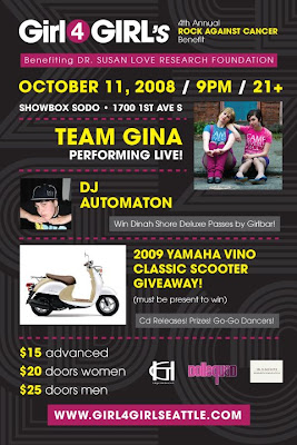 On Saturday, October 11th, the Girl4GIRL group hosts their 4th Annual Rock Against Cancer Benefit. Team Gina performs, DJ Automaton provides the music to dance, Dollsquad and Seattle Go-Go’s all dressed in pink.