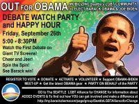 Out for Obama Happy Hour and Debate Watch sponsored by Seattle LGBT Alliance for CHANGE at Neighbours Nightclub – 5pm – 8:30pm.