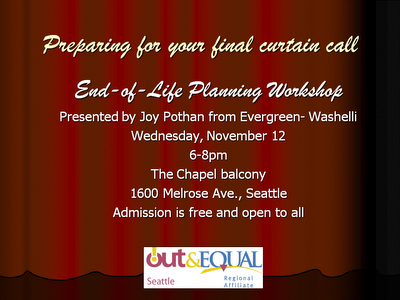 Out & Equal Seattle invites you to attend this year’s final Professional/Personal Development Workshop. Joy Pothan from Evergreen and Washelli will be providing a presentation on end-of-life planning.