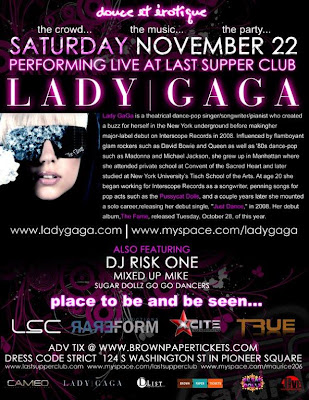 Lady Gaga returns to Seattle this weekend for an opening gig with NKOTB at the Tacoma Dome. If you don’t have tickets to that concert she will be making an appearance at Last Supper Club in Seattle. Tickets are $20 in advance. The event has a “Strict Dress Code” which to me means it will be primarly a straight event, but if you really want to see Lady Gaga.