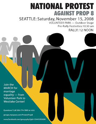 BIG HUGE protest involving many many thousands of people in Seattle is being organized this weekend by Join The Impact over the passage of Prop 8 in California. The protest is at Volunteer Park on Capitol Hill on Saturday November 15, 2008 beginning at 10:30am with a rally at Noon. There will be a 2.5 mile march to Westlake Center in downtown Seattle immediately following the Volunteer Park rally for another rally in downtown at Westlake Center at 2pm.