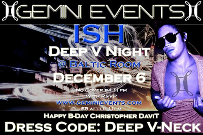 ish at Baltic Room is this Saturday December 6, 2008 from 10pm to 2am. Presented by Gemini Events, this monthly event features the hottest local DJs of Hip Hop, Old Skool, New Skoolish and Mash-Ups. Dress code for the night is Deep V-Neck. Cover is 5 bucks but instead go to their website here. Get on their VIP/Guest List and get there before 11pm.