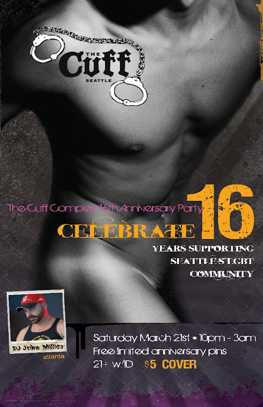 This is sure to be a huge Anniversary Weekend at Cuff. On Friday, the night features DJ Mike Tolleson at Black Party until 3am (black attire requested). Earlier that evening the Washington State Leather Organization kicks off their main weekend over at Lifelong with a meet and greet so the action at Cuff is sure to start early. A group of guys are in town from Saturday’s Bearracuda event and will be at Cuff and CC Attle’s on Friday night to party down before their big event on Saturday at Chop Suey.