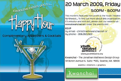 It’s time for another Kwanchai Happy Hour from Jonathan Mathews Design Group on Friday March 20, 2009 at their South Lake Union office space. Kwanchai hosts a monthly Happy Hour in support of a different local nonprofit or charitable organization within our community every month. Some of the past recipients include Safe School Coalitions, Camp Ten Trees, Rise N’Shine, Equal Rights Washington and Lambert House among many many others.