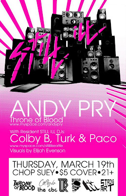 Before King Cobra shut its doors last month, the club hosted a brief but successful run of Still Ill. Hosted by DJs Paco, Colby B, and Turk (veterans of Hot Mess, the McLeod Residence, and more), the monthly night featured an indie-kid-friendly collection of rock remixes, party rap, house, techno, and all other manner of Hype Machine–approved “bangers”—not to mention a great crowd. Still Ill is moving to Chop Suey, kicking things off with East Coast DJ Andy Pry from the Rapture’s Throne of Blood label. It’ll be like Club Pop, only with drinks on the dance floor and no bands or teenagers.