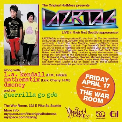 The Hype Machine named LaZRtag’s Crystal Castles/Crimewave Remix to their ‘Top Tracks Of 2008’ list. They produce quality electroHOUSE that brings the FUN back to the dancefloor.Larztag has done remixes for: Timbaland, Crystal Castles, Rhianna, Michael Jackson, Tings Tings, M.I.A., One Republic, Estelle, and Kanye West. Their remix of “Gimme More” is currently being featured on Britney Spears live tour “Circus”!