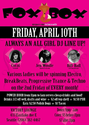 Opening night is Friday April 10th at Victory Lounge with DJs Coral, Jen Wolfe, and Riff Raff. On the 2nd Friday of EVERY month, these ladies will be offering up a variety of beats including: Electro, BreakBeats, Progressive Trance and Techno.