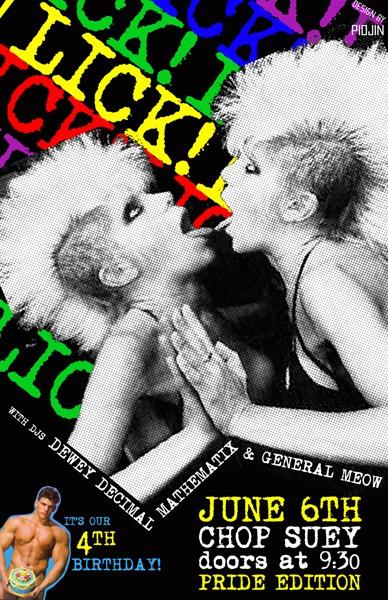 On June 6, 2009 LICK! at Chop Suey returns for its 4th birthday with its Pride Edition. With DJs Dewey Decimal, Mathematix and General Meow. Doors open at 9:30pm.