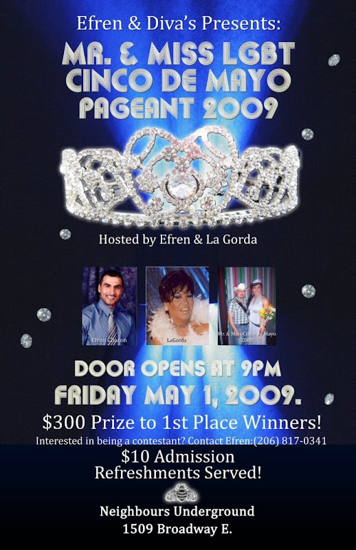 The Mr & Miss Cinco de Mayo Pageant at Neighbours Underground. Doors open at 9pm with $10 admission and refreshments.