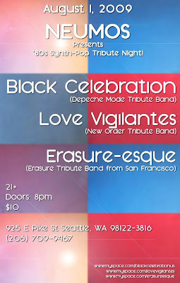 An amazing 80’s Synth Pop Tribute Night is at Neumo’s on Saturday, August 1, 2009. Featuring Erasure-esque (Erasure Tribute), Black Celebration (Depeche Mode Tribute) and Love Vigilantes (New Order Tribute).