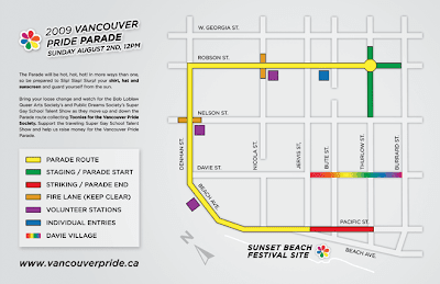 The 2009 Pride Parade will start in the heart of downtown Vancouver. The Parade begins at 12:00, Sunday August 2nd at Robson and Thurlow, heads West down the hill to Denman street, follows Denman to Pacific and Beach Avenue and finishes at the Sunset Beach Festival Site.