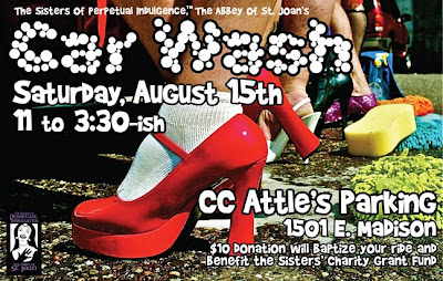 On Saturday August 15, 2009 from 11am – 3:30pm, the Sisters of Perpetual Indulgence hold a car wash at CC Attle’s, 1501 E Madison St. Your $10 donation will not only get your ride baptised, it benefits the Sisters’ Charity Grant Fund.