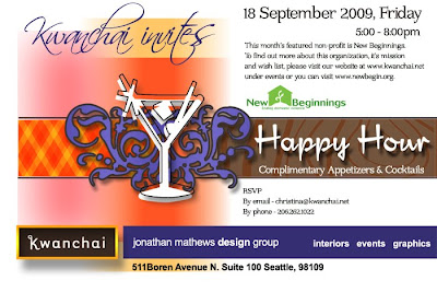 Kwanchai Happy Hour is Friday September 18, 2009 from 5pm – 8pm at Jonathan Mathews Design Group in South Lake Union, 511 Boren Avenue N, Suite 100 in Seattle. Be sure to RSVP for this popular monthly event.