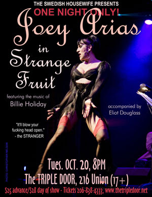 For one night only, Arias and Douglass will appear at the Triple Door, performing original works alongside the material of Ms. Holiday–as only Joey Arias can conjour her.