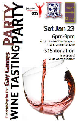 The SURGE Women’s Soccer Team is going to Germany and they are hosting an exciting Wine Tasting Party this Saturday January 23, 2010 at 12th & Olive Wine Company, 1125 E Olive St. from 6pm – 9pm. Proceeds from the event will help the Surge go to the Gay Games. Bring a healthy appetite for awesome wine (all tastes included with your $15 donation at the door).