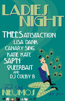 It’s Ladies Night tonight, Feb 9, 2010, at Neumos with a huge lineup of THEESatisfaction, Lisa Dank ft. The White Widows, Canary Sing, Katie Kate, Sap’n, Queerbait and DJ Colby B.