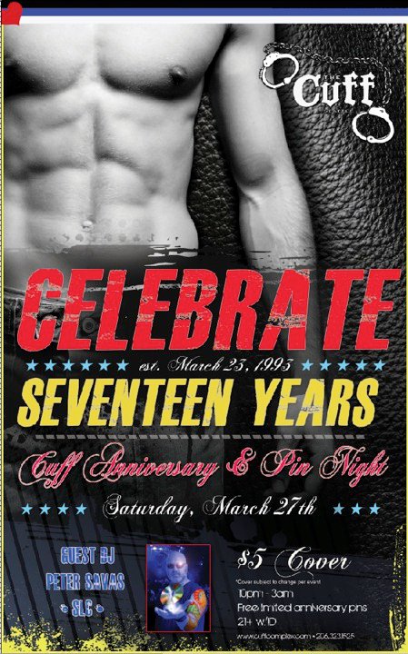 On Saturday March 27, 2010 it’s The Cuff’s 17th Anniversary Party from 10pm – 3am with the fabulous DJ Pete Savas from Salt Lake City for only his fourth appearance at Cuff. The Washington State Mr/Ms. Leather Contest is 7pm-9pm. $5 cover. Facebook event is here.