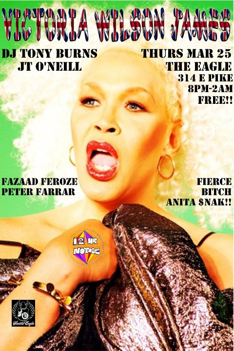 First up is The Eagle (314 E Pike St.) with their “London’s Calling” event. DJs Tony Burns and JT O’Neill start at 8pm with jello shots all night. Victoria performs at 11pm. The dancers are Peter Farrar and Fazaad Feroze (Seattle’s sexiest pizza boy!), and a special appearance from Anita $nak. “London’s Calling” at The Eagle is free and on facebook.