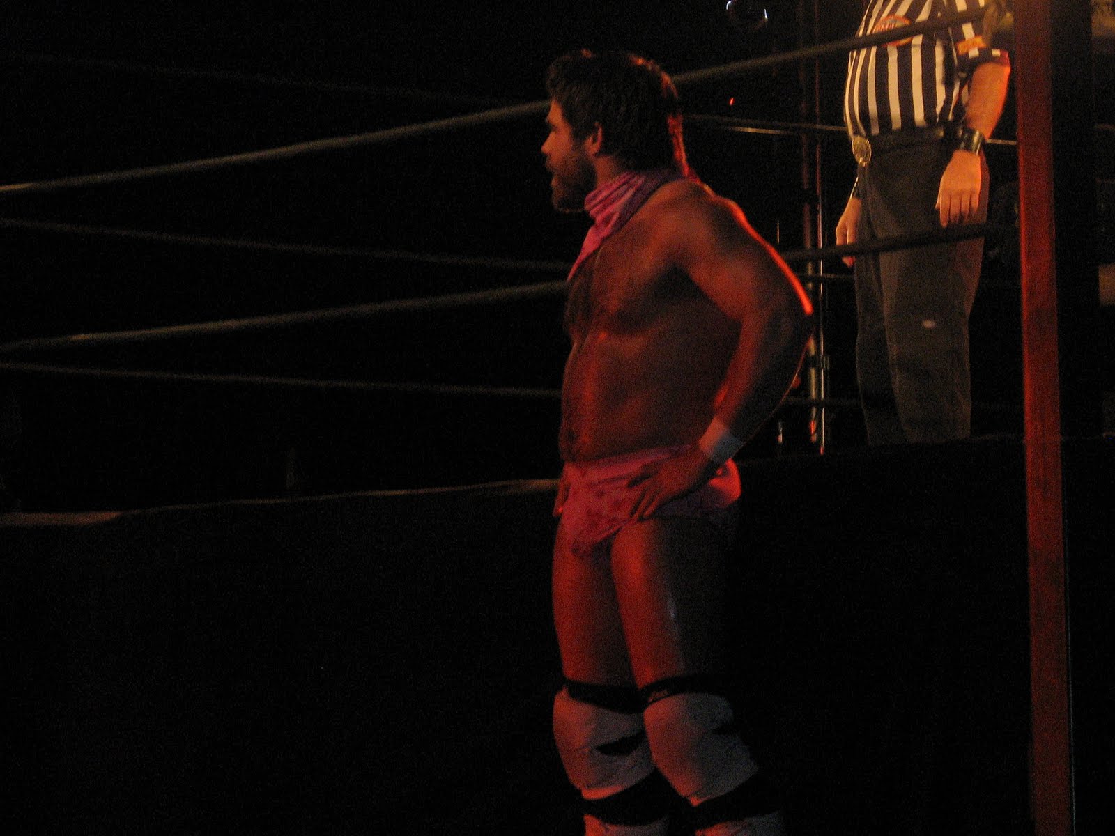 And, I encourage VaVoom to return to Seattle because the show IS immensely entertaining, a well-timed blend of sexiness, rowdiness and anarchic Stoogeian comedy. I had to leave at the first intermission, (headache/acute exhaustion from working 7 days in a row) but the two bouts and two strip acts I saw were all of high calibre. The luchadores featured in the first match were the husky but endearing Chocolate Caliente and the cocky, bratty, built like a brick sh**house, Joey Ryan. Ryan’s sexy strutting to his theme song, “Piña Colada” was a crowd favorite while Ryan’s beefy, hairy chest was a Strangeways favorite of the evening…The second bout was a tag team match and the definite stars of that bout were The Crazy Chickens, an energetically spastic duo prone to high flying attacks and frequent disco fits whenever the dj began blasting their theme song, DJ Farm’s “The Chicken Song-Techo Remix”. I loved them so much that I wanted to take them home with me! And Joey Ryan, but for different reasons…(Note: Joey’s pictures on the Lucha website aren’t very sexy…he now has short, sexy dark hair and he stopped manscaping/mutilating his beautiful chest pelt…)