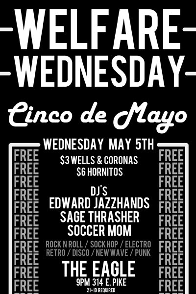 Oh look, more free things! Welfare Wednesday’s special Cinco de Mayo night at The Eagle. As always, $3 wells all night help you forget your job and boyfriend, life, etc, etc, oh and $3 Coronas and $6 Hornitos shots too! The best part about Wednesdays.. oh wait it’s cheap and free, sorry the second best part is a nice low key mixer with some wholesome (….no comment) dudes, that of course can at any point turn into a dance party thanks to DJ’s Edward Jazzhands, Sage Thrasher and Soccer Mom (who…? I dunno go find out!)