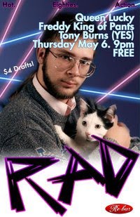 ‘RAD is an 80s dance party for your new wave and 80s pop needs! RAD will rad you up and tubular you down! With FREDDY KING OF PANTS, QUEEN LUCKY, & guest DJ….TONY BURNS!