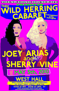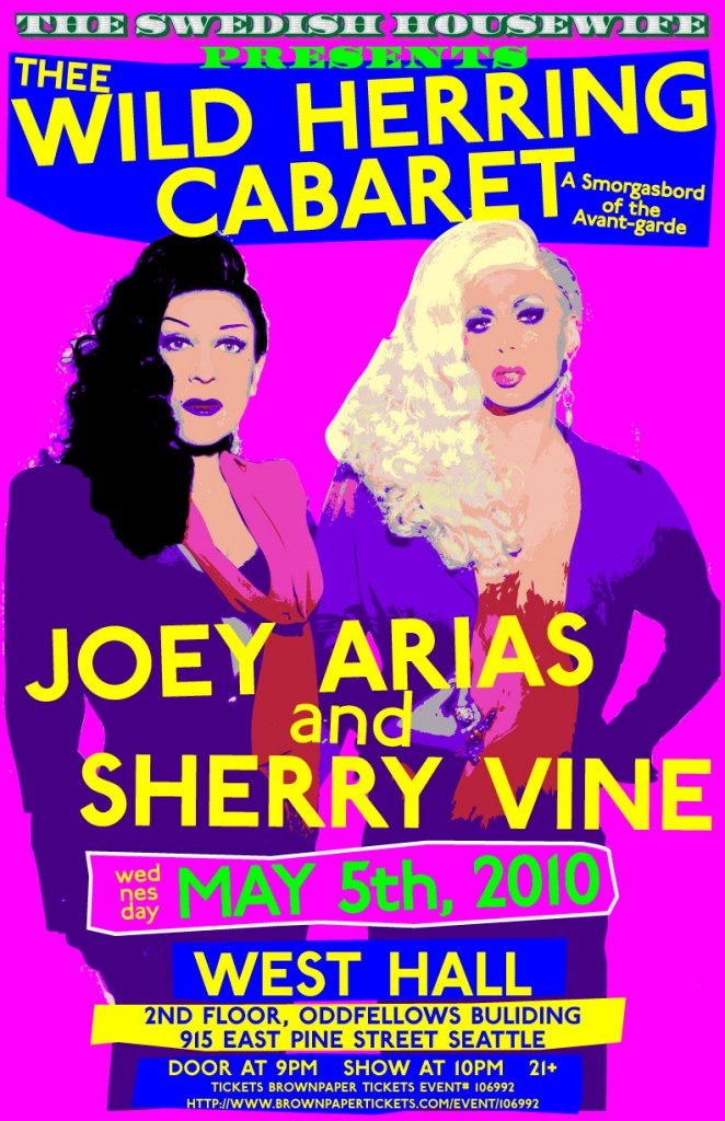 The multi-tasking dynamo known as Paula, The Swedish Housewife is keeping very busy programming not only her big, main stage show series known as The Gilded Stage at the chi-chi cabaret The Triple Door with the likes of Justin Bond and Immodesty Blaize, (and coming up in June, John Kelly in Paved Paradise: The Art of Joni Mitchell) but the wicked little sexpot has also managed to squeeze in time for a SECOND series of draggy/burlesquey/chanteusey shows she likes to call, Thee Wild Herring Cabaret, (no, I don’t understand the “Thee” part either…but, she IS arty!) which will be running almost monthly until the end of the year in the West Hall theater space at Oddfellows Hall, (2nd Floor, 915 East Pine Street) in the very, very hot and trendy Upper Pike/Pine/12th Street neighborhood of Capitol Hill. First up in this series which Miss Paula is calling, “a smorgasbord of the Avant-garde” and, “not your mamma’s neo-cabaret” will be the nationally renowned performance artists, Joey Arias and Sherry Vine in a duo show they call, “Looking Back at the Future!” Arias, a star of Cirque du Soleil’s Zumanity and Vine, founding member of Theatre Couture are Cabaret Superstars not only in New York, LA and Miami but have performed to captive audiences throughout the world. Looking Back at the Future is self-described by them as, “sexy and funny with songs from The Andrew Sisters, Guns and Roses, Billie Holiday, Lady GaGa and more.” Who can pass up the opportunity to hear such an eclectic selection of music?