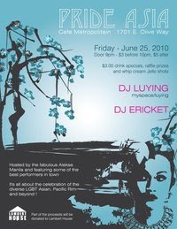 For folks of different cultural backgrounds, you have some options as well…Temple De Hirsch Sinai at 1441 16th Avenue is hosting a Pride Shabbat at 7pm with wine and appetizers for our Jewish LGBTQ community and their allies followed by Shabbat services at 7:30pm. And, our Asian/Pacific Rim LGBTQ friends are hosting a do called Pride Asia at Cafe Metropolitain starting at 9pm with hostess Aleksa Manila and the usual suspects of dj’d music by DJ Luying and DJ Ericket and drink specials of various kinds, hopefully with lots of little umbrellas in them…