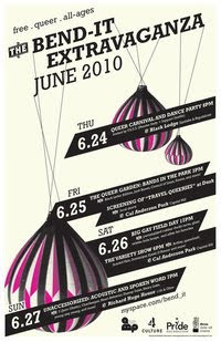And, for families and non-drinkers, there’s the option of Bend-It’s all-ages festival which continues today in Cal Anderson Park with a music line-up that includes The Redwood Plan, Hail Seizures, Black Letter Edition Junk Bones, Emma and many more…it starts at 3pm and the music will be followed by a screening of Travel Queeries at dusk with locally made short films…you can bounce back and forth between this festival and the rugby match at the playing fields and make it an alkyhol-free but family friendly Pride night of fun…check it out!