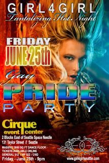 So many Pride events are geared towards booze and bulges it behooves us to provide alternatives for those in the community less geared toward consuming alkyhol and gawking at semi-nekkid men…some people like consuming alkyhol and gawking at semi-nekkid WOMYN so it seems fitting we mention that the Wildrose is hosting numerous events including tonight’s big hoopla that includes a set by FTM trans DJ Mathematix and a wet t-shirt contest at 10pm with MC Frat Boy…Ladies Who Love Ladies have decadent, lusty needs to ogle same-sex flesh, TOO! OR, for you Ladies who need a little break from the Seattle’s only lesbian bar, you can check out the HOT-HOT-HOT action at Girl4Girl’s Gay Pride Party at the Cirque Event Center, two blocks EAST of the Space Needle at 131 Taylor Avenue North. There will be a massive 3000 square foot dance floor, music by DJ Stacey, performances by Fuchsia FoXXX, Go-Go dancers and so very much more…it starts at 9pm and will probably end sometime around next Tuesday (not really). Oh, and it’s obviously 21+ and according to the site, MEN are allowed in as well…just behave yourselves and don’t be all creepy about seeing Ladies Dancing and Making Out with Other Ladies! (you know who you are…)