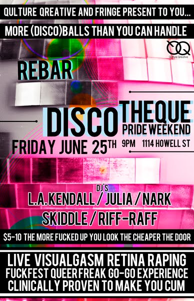 Qulture Qreative (Hard Times, Hot Mess) and Fringe Presents (Fringe, Snackhole) team up to bring a Queer alternative to Seattle’s Gay Pride Weekend lineup! Partygoers are in for a live visualgasm, retina raping fuckfest, queerfreak go-go experience that is clinically proven to make you cum! Dress to express! The more effort you put into your outfit, the less you’ll have to shell out to get in the door!