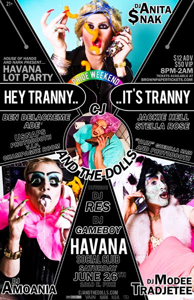 House of Hands and Nark Present Hey Tranny! Its Tranny! @ The Havana Social Club & Parking Lot, at Hey Tranny Its Tranny you’ll get ALL the drunk, ALL the laid, and more tranny action than the back of The Stranger!