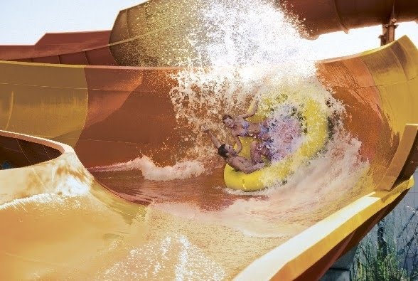 I am betting in August there will be lines to get inter tubes for some of the tube slides but you can rent your own for $8 for the entire day and skip the lines. If you have a pair of water shoes they come in handy to avoid walking on the pebbles laying out on the pavement between slides and flip flops just get in the way of riding the water slides.