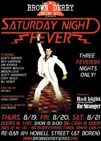 It’s not a secret that I love, love, love the folks at Brown Derby Players, the Ian Bell led theater group who put on parody versions of beloved film favorites from the last thirty years featuring the best comedians and actors in town including Nick Garrison, Brandon Whitehead, Imogen Love and many, many more. Every year, their season has a theme and this year’s theme is GREAT, movie musicals from the late 70’s and 80’s (June’s production of “Purple Rain” was hysterical with a brilliant comedy and singing performance from Scott Shoemaker, lead singer of “The Quit”) and this week’s production of the beloved disco lovin’, BeeGee’s soundtrackin’, John Travolta boogyin’ hit “Saturday Night Fever” should be JUST as divine as the last show. Starring longtime Brown Derby powerhouse comedian Dusty Warren as Tony Manero, the show also features the usual list of suspects including Nick Garrison, Freddy Molitch, Imogen Love, Brandon Whitehead, MJ Sieber, Scott Shoemaker and Kim Nyhous with choreography by Diana Cardiff and tech design by Ross Whippo. SNF runs this Thursday, Friday and Saturday at Re-bar, 1114 Howell Street, the doors open at 7pm and the show starts at 8pm. It’s $16 (worth every penny), CASH at the door, 21+, NO reservations and you’d better arrive EARLY to get a seat! (AND, no damn CUTTING in line, or HOLDING places in line for your LATE arriving friends; that is just BULLSH*T and makes me want to punch various hipsters in the THROAT for being so DAMN rude!!!!)