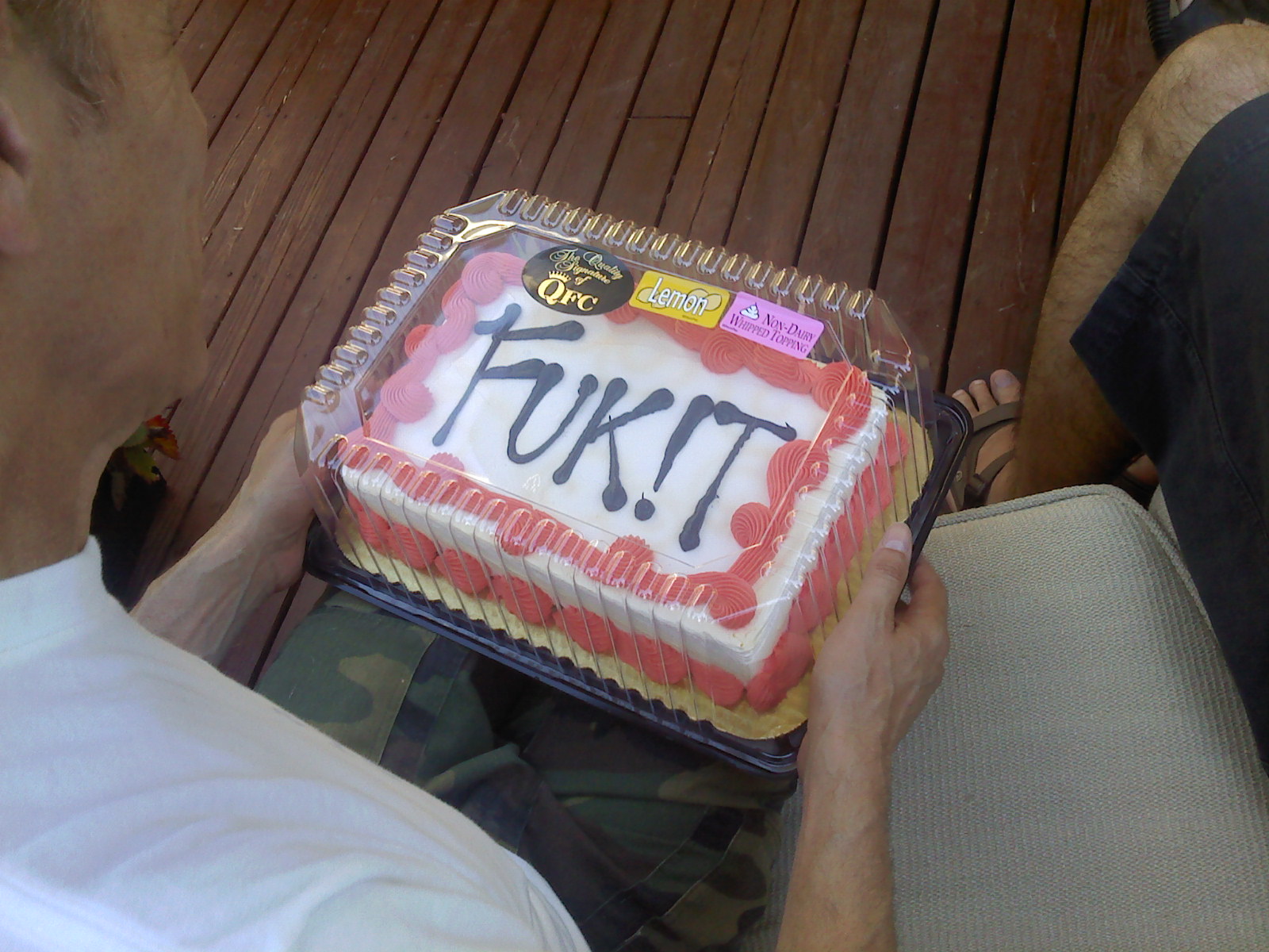 3) I wasn’t very symptomatic on Sunday (sore throatish and in denial about it) and I went to a SeaFukIt bbq hosted at a very lovely home in West Seattle. If you’re not aware, SeaFukIt is a new safe sex advocacy group, modeled after the original in DC, that uses STRONG graphic imagery to reach out to the many, many sexually active gay men who are NOT practicing safe sex. Please check out the website, but remember that it is NOT SAFE FOR WORK or for the prudish! The bbq event was designed as a team bonding social event for the volunteers involved with the group (yes, I am volunteering my time and “talents” to this fine organization) and it was a lot of fun, (but not “naughty” fun, if that was what you were thinking…though one guest did strip down to his American Apparel briefs, but, it WAS very hot outside…). A couple of the guests (one of whom’s name rhymes with Jaleska Janilla) very kindly brought a very special cake to the party and reported that the very sweet older lady at the QFC bakery counter didn’t have a problem with creating a “FukIt” cake…Bless her little heart. Oh, and SeaFukIt has all sorts of interesting plans for the future…we’ve already started distributing condom kits and they’ll be some very exciting events happening in the future…tongues WILL be wagging!