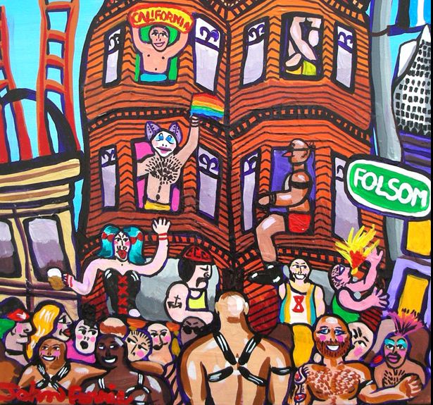 The folk-art naivete style of John Ferrie’s work is charming and innocent and ironic considering it’s a poster for an event featuring naked men in leather boots and even leatherier old c*cks exposed to the sunny chill of a Sunday morning in San Francisco…