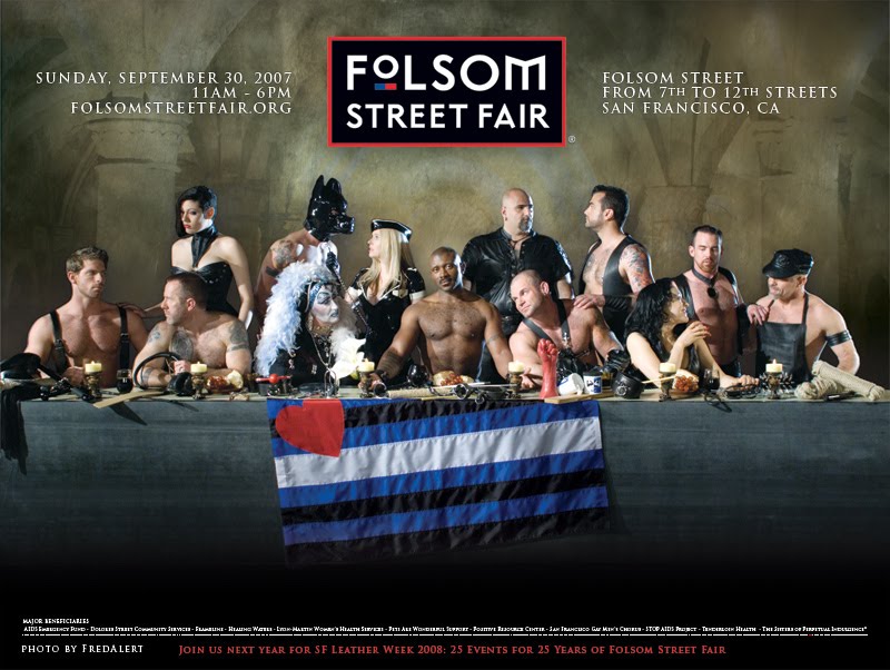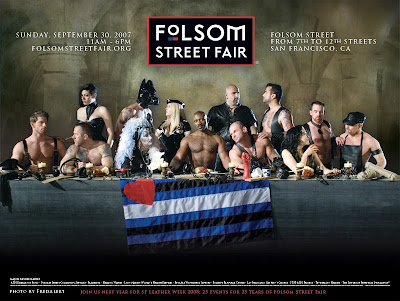The raunchy, (I mean REALLY raunchy!) annual Folsom Street Fair is happening this coming Sunday, September 26 in San Francisco and I know there’s always a few Seattle sex pigs, perverts, SEXUAL SOCIOLOGISTS who like to “go down” and do a little practical “field work” during this “seminal” and very “public” event, but for the rest of us poor, pious souls that is out of the question. We can live vicariously though, through the POSTERS for the event which are always illuminating, titillating, obscene, controversial and frequently very graphically daring and artistic. (The infamous “Last Supper” poster from 2007, pictured above, caused a storm of controversy from some religious groups for being “blasphemous.”) They seem to already have an official poster for this year’s event but they are also having a contest where fans can go to the NOT VERY SAFE FOR WORK Folsom Street Fair website to vote for their favorites. So you eager beavers don’t get fired, here are pix of some of my favorite entries. (The unemployed and those working for decadent businesses like The Stranger or Amazon.com, go ahead and go and look at the site with its plethora of ads for sex masks and cock rings…)