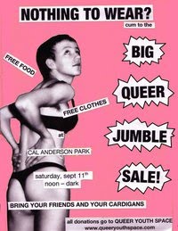 The adorable and cute kids from the group, “We Need Queer Youth Space!” are throwing an old-timey Jumble Sale TOMORROW, Saturday, September 11 at the Healthy Times Fun Club at 11th and Pike from Noon to 6pm. They are calling it a “Big Queer Jumble Sale” and promise the following: