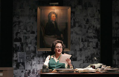Director Valerie Curtis-Newman does a fine job of staging the work on the tiny, cluttered set in ACT’s cabaret theater. The set itself, Eppie’s study in her high-rise luxury Chicago apartment, is excellent and captures the mood and style of the period and was well designed by Martin Christoffel. And, some kudos to the ACT props department for what must have been HOURS and HOURS of research and work to create/find the hundreds of letters used as props in a show about an advice columnist who receives thousands of letters a day. SOMEONE in a workroom at ACT probably went blind putting that together. ACT needs to give them a big bonus at Christmas.