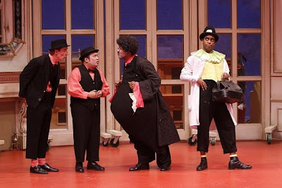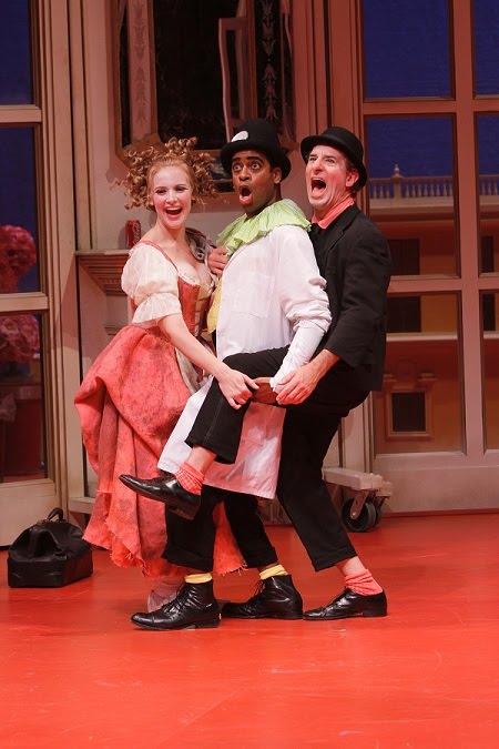 This is one of those shows where everyone involved does a fantastic job so it’s impossible to leave anyone out so it’s best to just start with the top and start spreading the love. Director and co-adaptor Christopher Bayes is internationally known as an expert in Commedia del’ Arte, the 16th century Italian theater art form best known to modern audiences as the forerunner of “Punch and Judy”. Mr Bayes, and his co-adaptor Steven Epp are also known for their many years with the very much acclaimed, (and much lamented since its demise a few years back) Minneapolis theater company, Theatre de la Jeune Lune where they created many, many excellent new productions and revised texts of classic works in the styles of the Commedia. Their work here, on “Doctor” revisits their previous experiences creating fresh takes on classic texts at Jeune Lune, (I lived in Minneapolis; I’ve seen their amazing work). And, if you are a purist, you might be shocked at this adaptation. Mr Bayes and Mr Epp have made this a very contemporary take on 18th Century traditions. There are vacuum cleaners and wrist watches and tennis shoes and Gothy teenaged girls in their version of “Doctor” and musical snippets alluding to pop songs, commercials and tv shows. The bewildered squire bears more than a passing resemblance to an Eddie Murphy movie character and there’s gay jokes and vogueing. But, it never overwhelms the play; it only grounds it and makes it relatable to contemporary audiences. Molière was a commercial comedy playwright, a combination of Neil Simon and Judd Apatow. His plays were MEANT to be funny and rude and naughty and commercial and topical. I think he would hate most productions of his work because they are staid and reverent and academic shrines to “tradition”. Molière was that rare combination of brilliant artistry and commercial shrewdness; I’m thinking that he would very much heartily approve of this adaptation and Mr Bayes fresh, witty take on the direction of the play. Not every bit works, but Bayes keeps things moving along at a brisk pace like an old-school vaudevillian. There’s always something interesting, or odd, or strange, or colorful and lively going on his stage. He makes it magical and cirque-like, not ponderous and texty. It’s a wonderful script and very smart and sly staging.