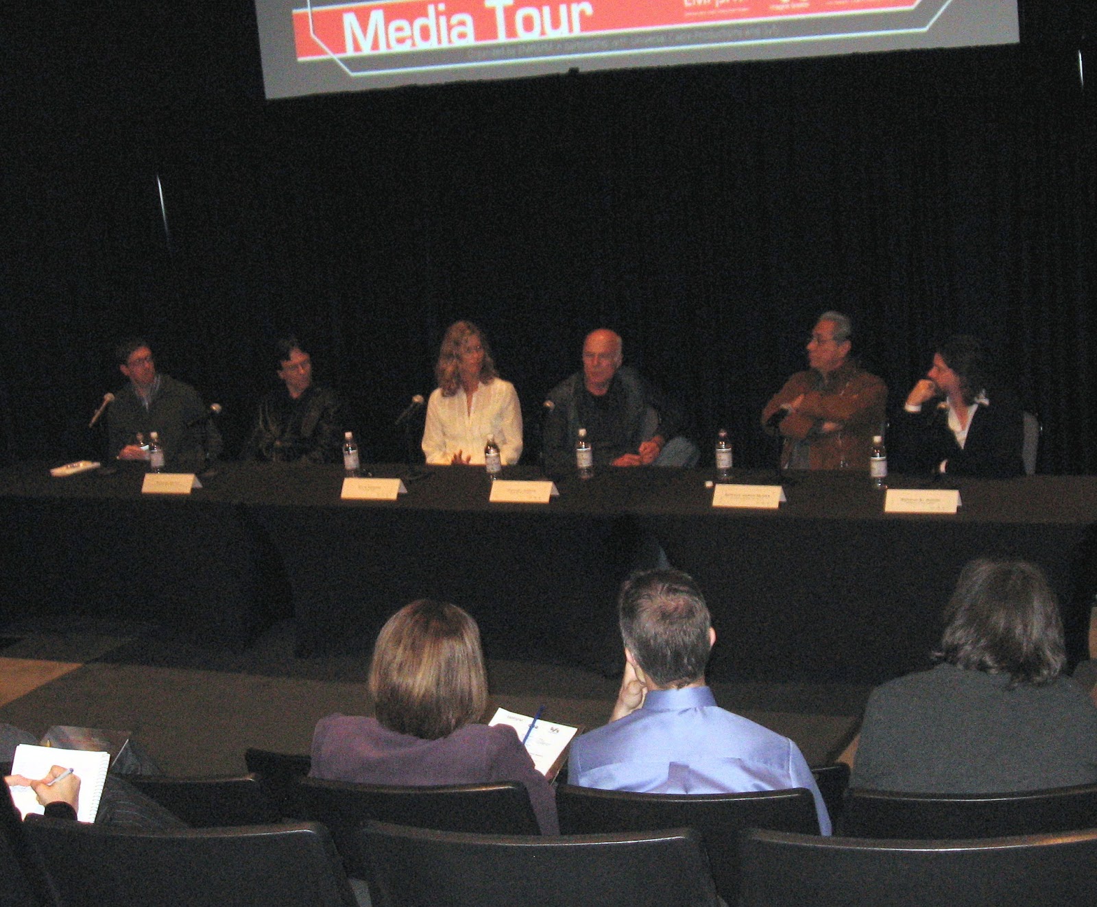 The press conference wasn’t very long and it wasn’t very illuminating but it’s always interesting to see actors from favorite shows, in the flesh…for one thing, they’re always either BETTER or WORSE looking in reality, and usually much shorter than you would have imagined. The panel at the press conference consisted of star Edward James Olmos, (Admiral Adama); Michael Hogan, (Saul Tige); Kate Vernon, (Ellen Tige) and Richard Hatch, Apollo in the original series who also had a recurring role as Tom Zarek in the reboot. Also present, producer/writer Ronald D. Moore. The questions asked by the audience weren’t very interesting or profound and the answers were usually a bit dull and long-winded. Edward James Olmos is a talented actor, but he’s a serious kind of guy, and some of his stories went on a bit long…at one point, co-star Michael Hogan tried to gently guide him to concluding one anecdote, but without much success.