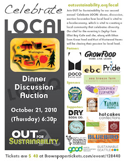 You are warmly invited to join OUT for Sustainability for our second annual “Celebrate LOCAL” on Thursday October 21st, 2010. This dinner will feature local food and beverages, a panel discussion on local food as a pivotal part of a local economy and a silent auction featuring local green and queer friendly businesses. All of this will be cast in the light of the LGBTQ community, building community with fantastic people. Our chef is rising star Zephyr Paquette from Elliot Bay Cafe and partners include Grow Food, Viva Farms and Sustainable Seattle and with other support from Dry Soda, Emmer and Rye, Hot Flash, Chinook Book and more.