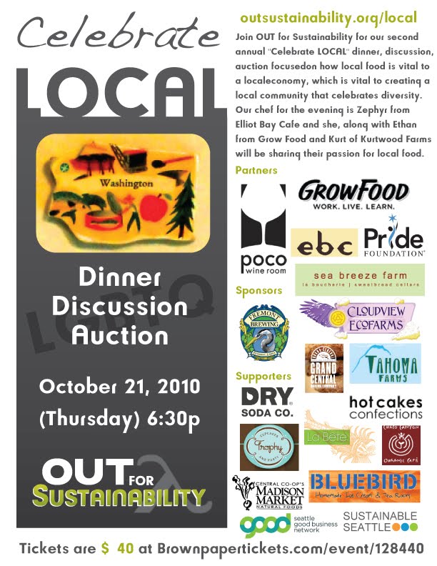 You are warmly invited to join OUT for Sustainability for our second annual “Celebrate LOCAL” on Thursday October 21st, 2010. This dinner will feature local food and beverages, a panel discussion on local food as a pivotal part of a local economy and a silent auction featuring local green and queer friendly businesses. All of this will be cast in the light of the LGBTQ community, building community with fantastic people. Our chef is rising star Zephyr Paquette from Elliot Bay Cafe and partners include Grow Food, Viva Farms and Sustainable Seattle and with other support from Dry Soda, Emmer and Rye, Hot Flash, Chinook Book and more.