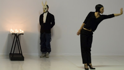 The curtain opens on a white box. A couple dozen small, votive candles randomly spaced on the floor. Hanging from hooks/chains descending from the rafters are 7 totemic items, vaguely representative of ceremonial costumes or items of idolatry. There is a long, rectangular, wheeled table/cart at the back of the stage. There is a man, casually dressed, with a belt of worry beads around his waist that clank when he walks. He is wearing a demented looking rabbit mask, a la “Donnie Darko”. He walks around the stage and observes and finally notices a woman, laying supine on the table. She rises off the table and she begins to move about the stage, tentatively at first, and taking classical dance positions and poses. Rabbit man observes then begins picking up the candles off the floor and taking them to the now empty table and arranging them on it. There is no sound at all, save the clanking of the worry beads around his waist as he moves. Neither speak. Tableaus are formed and small vignettes played out. Eventually, music is introduced; very loud, industrial, violent music. Things get…intense. You almost expect the stark white walls to be splayed with blood; the intensity seems to demand it. The nightmare, or the dream, if you prefer, ends. And, like most dreams, you’re left a bit disoriented and unsure. What, just happened? Did it mean something, or was it only a dream, a fragment of the subconscious? Or, is it just arty noodlings with cool lighting and noisy industrial music? Art is in the eye of the beholder…you decide.
