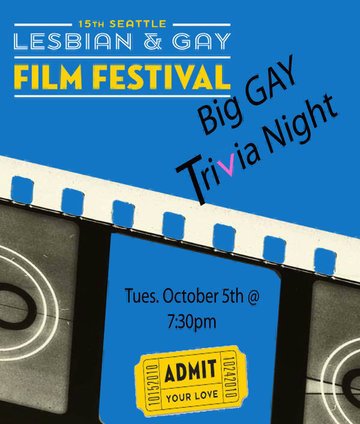 Three Dollar Bill Cinema is co-hosting this week’s Big Gay Trivia Night at The Lobby Bar tonight, Tuesday, October 5 and in honor of the upcoming Seattle Lesbian & Gay Film Festival, this week’s theme will be Movie trivia “with a queer kick”! Here’s the details: