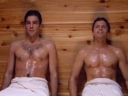 | Zach in a a sauna (left) in a still from that cheesy Tori Spelling show he made pre-Heroes fame. |
