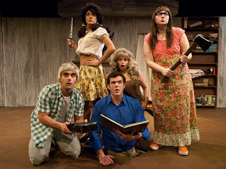 Some folks idolize gore/horror films, (you know who you are, you Fangoria subscribers!) and some folks can’t abide them. I’m in the middle on that argument; I like GOOD gore/horror, when they’re smart, witty and cleverly executed. Few such films exist in this genre, but one of the best examples would be Sam Raimi’s “Evil Dead” series of films. The original, ultra-low budget film has been a horror classic since its initial release in 1981 and has a large and loyal cult following, (star Bruce Campbell and other actors from the film were just in Seattle this weekend for ZomBcon). And, since musical theater producers are desperate for new, sure-fire properties to adapt into stage musicals, it only makes sense that some enterprising Canadians would turn this classic “gorror” film into a campy, “Rocky Horror” style musical. I’ve not been shy about bitching about the lazy trend of turning any old movie into a musical, mainly because it seldom works and it’s artistically lazy and dull, but I’m happy to report that “Evil Dead: The Musical” is a fun, witty, silly theater event. It’s not deep, or meaningful, or significant, but it is a solidly entertaining two hours of live theater, for fans of the horror genre and the camp musical.