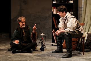 Playing in repertory with Seattle Shakes’ fantastic production of Hamlet, (see my swoony review of that excellent play, HERE), David Davalos clever and cunning play “Wittenberg” makes an ideal companion for the Shakespearean work. A “prequel” to the events in Hamlet, Wittenberg focuses on Hamlet’s life before the tragedies of that play when he was a normal, confused, but relatively cheerful student at the University of Wittenberg in the German city of the same name. Hamlet is a good kid, though conflicted about both choosing his major and his eventual fate as the King of Denmark. He looks to two mentors he has at the university, both professors and both famous in their own right: Reverend Father Martin Luther and John Faustus, MD, JD, Ph.D, Th.D. Yes, it’s THAT Martin Luther and it’s THAT Dr Faustus and the conceit of having a famous literary creation interact with a REAL famous theologian and another equally famous literary character is what drives this play. In lesser hands, it could be gimmicky and overly twee, but David Davalos has written a sharp, charming play with snappy dialogue, clever and witty constructions and a talent for conveying some deep emotions and philosophical thought but in a language that’s understandable to all. It might help if you’re up on your Shakespeare, your Faust and your history of the Protestant Reformation but it’s not a necessity. Wittenberg is entertaining and thoughtful enough for anyone regardless if they aced senior honors English or slept through it.