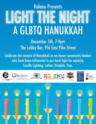 Light the Night: A GLBTQ Hanukkah is this Sunday, December 05, 2010 from 7pm-9pm at The Lobby Bar (916 East Pike Street)