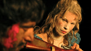 And, what IS this show all about? Gloria’s Cause is Ms Hanson’s take on American history with particular emphasis on the Revolutionary War and some of the disenfranchised participants in that war, including Deborah Sampson Gannett, a Continental soldier who cross-dressed so she could join in the fight. We also get moments with the Founding Fathers: Washington, Jefferson, Ben Franklin, (who talk in funny voices and lose their pants) not to mention visits from the aforementioned depraved American Eagle, Paul Revere and sundry real characters from the time period. Later in the show, we get a corny, but moving video montage that brings us up to 2010, but the focus is primarily on that late 18th century period in American history when our country was being created, and what we can learn from those beginnings to better help us understand how we have become, for better and worse, the complicated and confounding country we’ve become. It’s an interesting premise, and if you’ve ever read any of the work of noted historian Howard Zinn and appreciated it, you’re going to find some common ground in this piece. Ms Hanson, like Dr Zinn, wants to look at the stories behind the obvious ones…not to focus ONLY on the famous white men who “made” history and the big moments they created, but the lesser known men and women of different colors and social castes who contributed to those moments and other less well known events, in the history of this country. It’s an interesting premise and largely I think Ms Hanson and company have pulled it off…Gloria’s Cause is thought provoking and informative. It is also sometimes a bit diffuse and confounding. There’s a lot going on here.