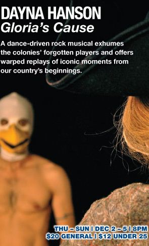 I’m exhausted after typing out those complicated credits! Really, wouldn’t it be easier just to say, “Created by the Ensemble” and list everyone? Choreographer/artist Dayna Hanson is a collaborationist and her latest piece, “Gloria’s Cause” is a multi-hyphenate wet dream. EVERYONE in this show pulls their weight and then some with multiple talents on display. There are nine performers on stage and each and everyone of them wears a number of different hats: singing, dancing, playing instruments, acting. This show features dialogue scenes, storytelling scenes, nude dance scenes without music, clothed dance scenes with music, musical numbers, filmed projections, and a depraved dancing eagle who sexually molests Ms Hanson. Not featured: any shirtless men as depicted in the ad seen on The Stranger. I cry “Foul” at this misrepresentation! (Or, would that be “Fowl” as the shirtless male in question is wearing the Eagle headpiece?)